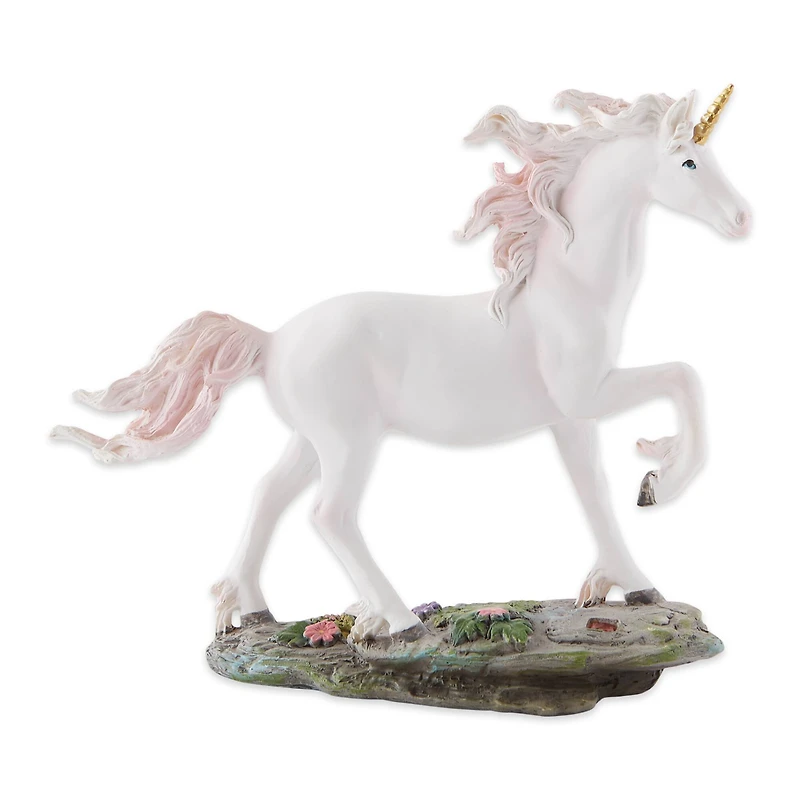 This mythical figurine weighs 0.8 lbs. and measures 8 inches by 2.25 inches by 6.37 inches. Made of durable and detailed polyresin that captures each fantastical facet. Use for a variety of purposes including bookshelf or room décor, outdoor garden accents, D&D accoutrement, or as a fantastic gift. This figurine can be anything you imagine! To clean your mystical figurine dust lightly or wipe with damp cloth as needed. Enchant your living space with this mythical and magical figurine. A beautiful white unicorn with a golden horn and pink mane and tail strides through a magical land that's filled with crystals and flowers. This mesmerizing décor piece is an excellent gift and will look stunning perched on a shelf, desk, or table.
