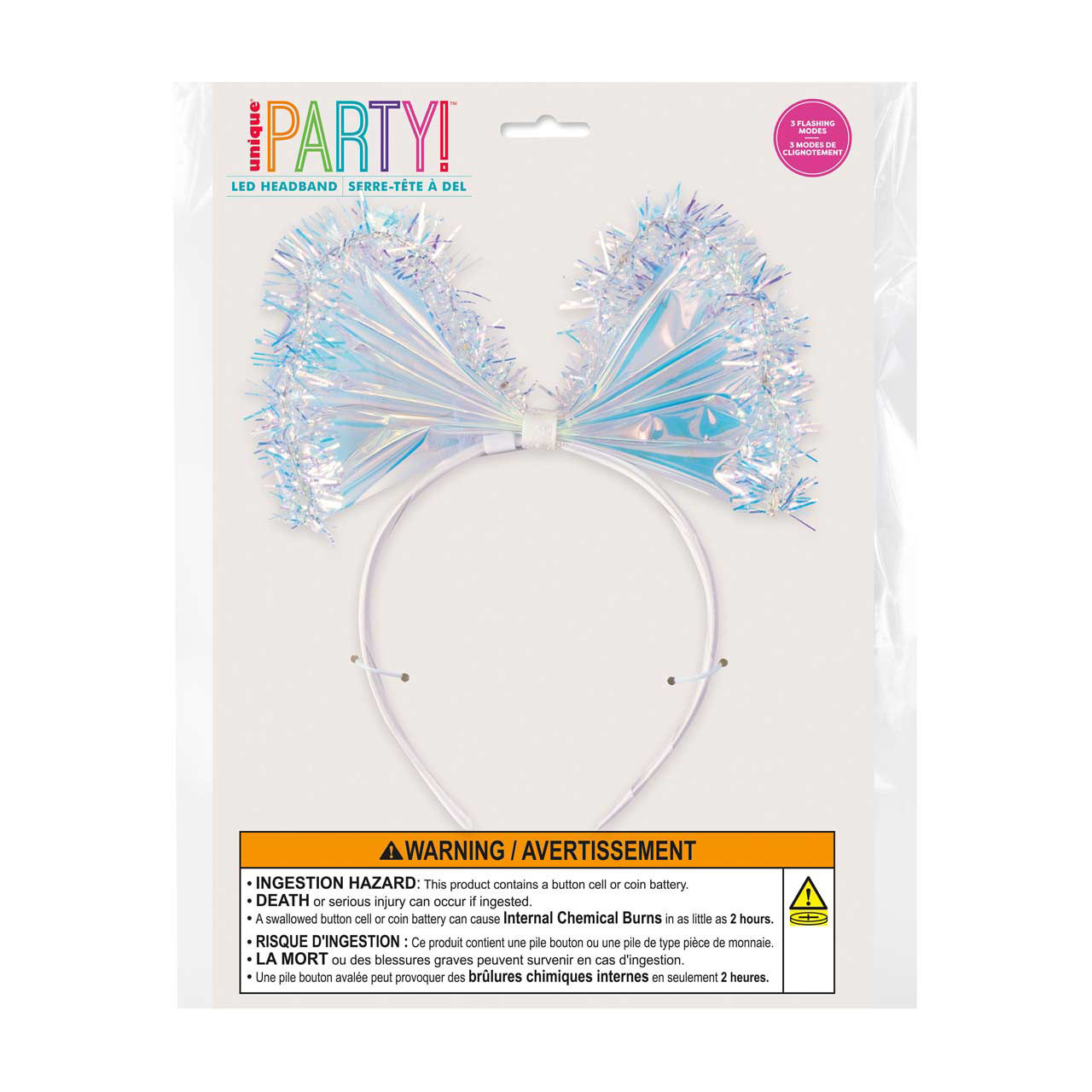 The headband features a large, iridescent bow adorned with shimmering tinsel that catches the light beautifully. The bow's holographic material reflects a spectrum of colors, creating a magical, sparkling effect. Embedded with LED lights, this headband offers three flashing modes that you can easily switch between, ensuring your look remains vibrant and lively all night long.