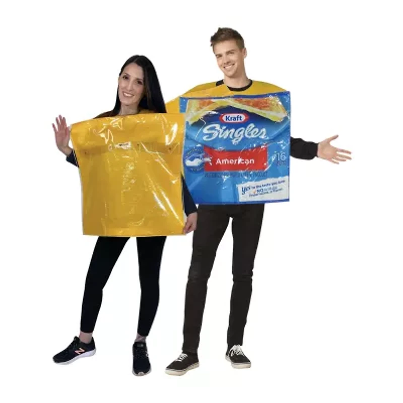 Kraft Single Pack Costume. What a slice! Be the most gooey couple at the party with this Kraft Singles Pack and Single Slice Cheese Couple Costume! Includes two tunics, printed on the front in likeness of the actual product. Slip on some matching solid pants and a shirt ( sold separate) to complete the look.