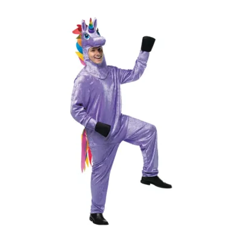 Trot and prance around outfitted as the most magical and magnificent creature in all the land! Perfect for Halloween costumes, this colorful ensemble is designed to look like a purple unicorn. And of course, it comes complete with a rainbow horn and tail. This high-quality, comfy costume can be sported by men or women to Halloween parties or while trick-or-treating with little ones. No matter where you don it, transforming yourself into the cutest mythical creature ever has never been easier! Polyester. 6 Ft 3", height; 38" - 44" waist; 48" - 52" chest; 32" - 35" inseam. One size fits most adults upto Large. Includes: