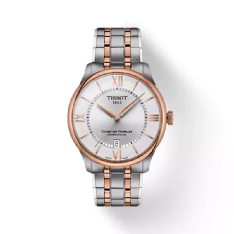 Close your eyes and think of a pure Swiss watch and you’ll see the Chemin des Tourelles. Named after the street that leads to Tissot's home in the Swiss mountains, it’s Tissot’s icon: round, classic, mechanical, ageless. Now updated and refined, this edition has a gently domed sapphire crystal that sits over a soft-sunray dial with simple, elegant baton hour markers, each faceted to catch the light in an understated but sophisticated way. And under that is the Nivachron Powermatic 80, a state-of-the art automatic mechanical movement with an 80-hour power reserve and elevated anti-magnetism. A watch for all time. Foldover clasp Analog dial Automatic movement Polished finish Date display Choking hazard Warranty available, Limited liability warranty, 2 Years of Warranty Switzerland Imported Product Specifications 39.00 mm 39.00 mm Material & Care Stainless steel Clean with a soft cloth.