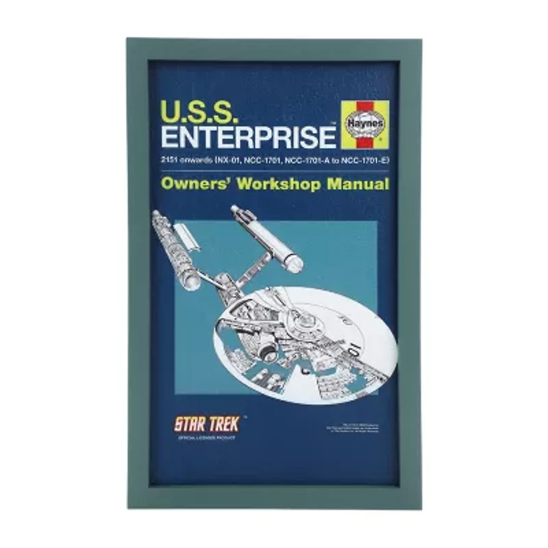 Bring the adventure of Star Trek to your home with this striking blue wall frame. Featuring a detailed image of the iconic U.S.S. Enterprise, this piece makes a bold statement in any space. Measuring 11" x 18", it's perfect for living rooms, bedrooms, or entertainment areas. Crafted with durable wood and gelcoat, this frame is designed for lasting quality. Simply wipe it clean with a damp cloth to keep it looking pristine.