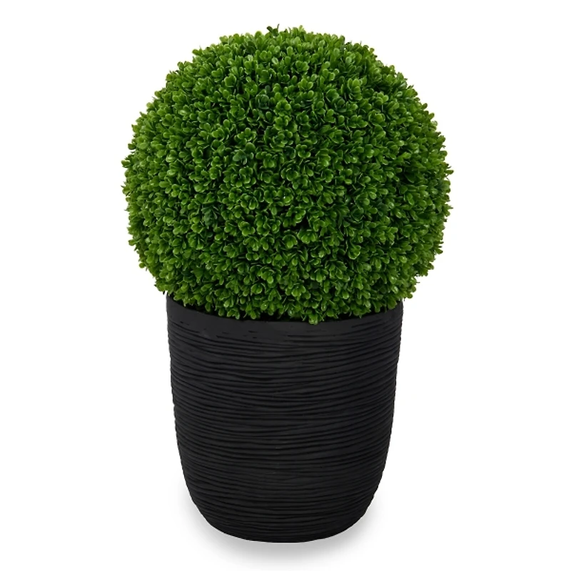 Make your home look perfectly polished with UV Boxwood Ball Topiary in Black Pot. This faux garden shrub boasts a full, lifelike look without any of the maintenance. Style it anywhere from a reading nook to a covered front porch for an instant refresh. Plant measures 22H x 12 in. in diameter Crafted of plastic, polyfoam, ceramic, rock, iron wire Artificial topiary ball design Housed in a black ceramic pot with textured finish Hues of green and black UV treated Comes ready for display Care: Dust with a soft, dry cloth. Contact your local Kirkland's store for availability. Quantities and selection may vary by location.