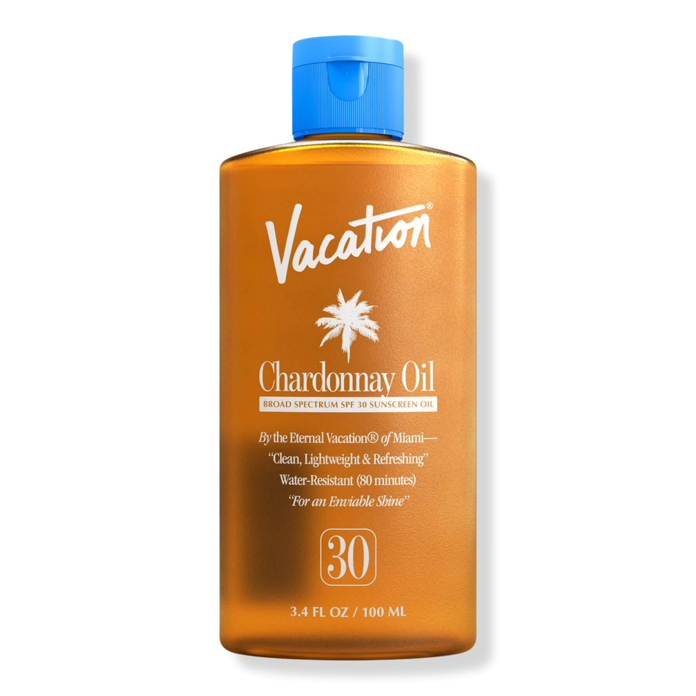 SPF 30 CHARDONNAY OIL 3.4FLOZ. Benefits: Broad spectrum SPF 30 protection against the sun's harmful UVA and UVB rays. Water-resistant (80 minutes). Made from Champagne (grape seeds). Contains Vacation's alluring and effervescent Grand Cuve scent. Lightweight feel. "Classic" formulation process to update everything that you love about sunscreens of the past with the best of modern skincare science. Transparent on all skin tones. Dermatologist tested. Manufactured in the USA. Travel-friendly packaging made with recycled materials. Every Vacation formula is dermatologist tested and reviewed by toxicologists to ensure world-class protection. Key Ingredients: Chardonnay Grape Seed Oil - An effervescent, non-greasy oil that delivers an enviable shine. Marula & Passionfruit Seed Oils - Nutrient-rich oils to help support your skin barrier during long days by the pool. Jojoba & Shea Oil - Rich, emollient oils to keep skin feeling soft and smooth during and after sun exposure. Vitamin E - A vitamin renowned for its ability to replenish sun-exposed skin. Bisabolol - A soothing ingredient derived from German Chamomile to help minimize irritation from the sun. Formulated Without: Oxybenzone. Octinoxate. Parabens. Phthalates, PEGs, Beeswax. PEGs. Beeswax. Mineral Oil. Aerosols.