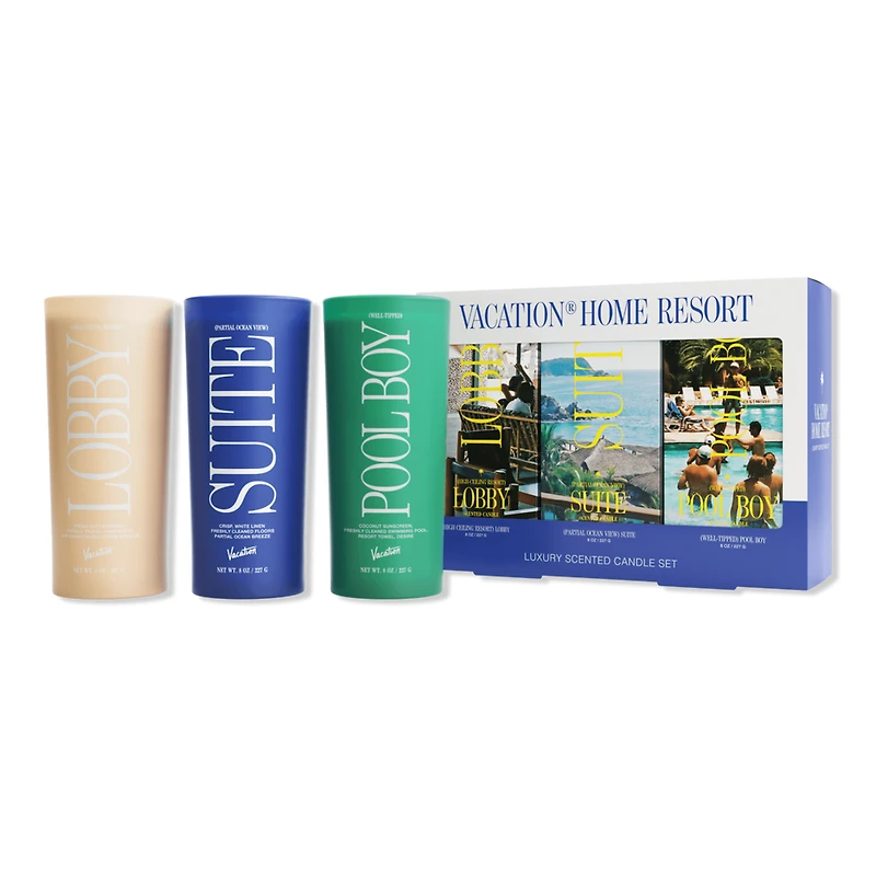 VCTN CNDL HM RSRT KT (3X 8Z) MLT. Features: 3 x individual scented candles. Luxury soy-blend wax. 85hr burn time on each candle. Generously tall glassware. Fragrance Family: High Ceiling Resort Lobby: Fresh cut flowers, high gloss magazines, delicate swells of air-conditioned ocean breeze. Well-Tipped Pool Boy: Coconut sunscreen, recently de-leafed swimming pool, resort towel, a dash of hand-me-down-cologne, desire. Partial Ocean View Suite: Crisp white linen, freshly cleaned surfaces, partially-obstructed island breeze. Includes: High Ceiling Resort Lobby Candle (8.0 oz). Well-Tipped Pool Boy Candle (8.0 oz). Partial Ocean View Suite Candle (8.0 oz).