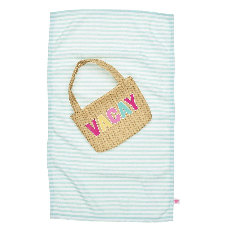 Get your furry friend in vacay mode with this cute striped towel and woven tote bag set for stuffed animals.