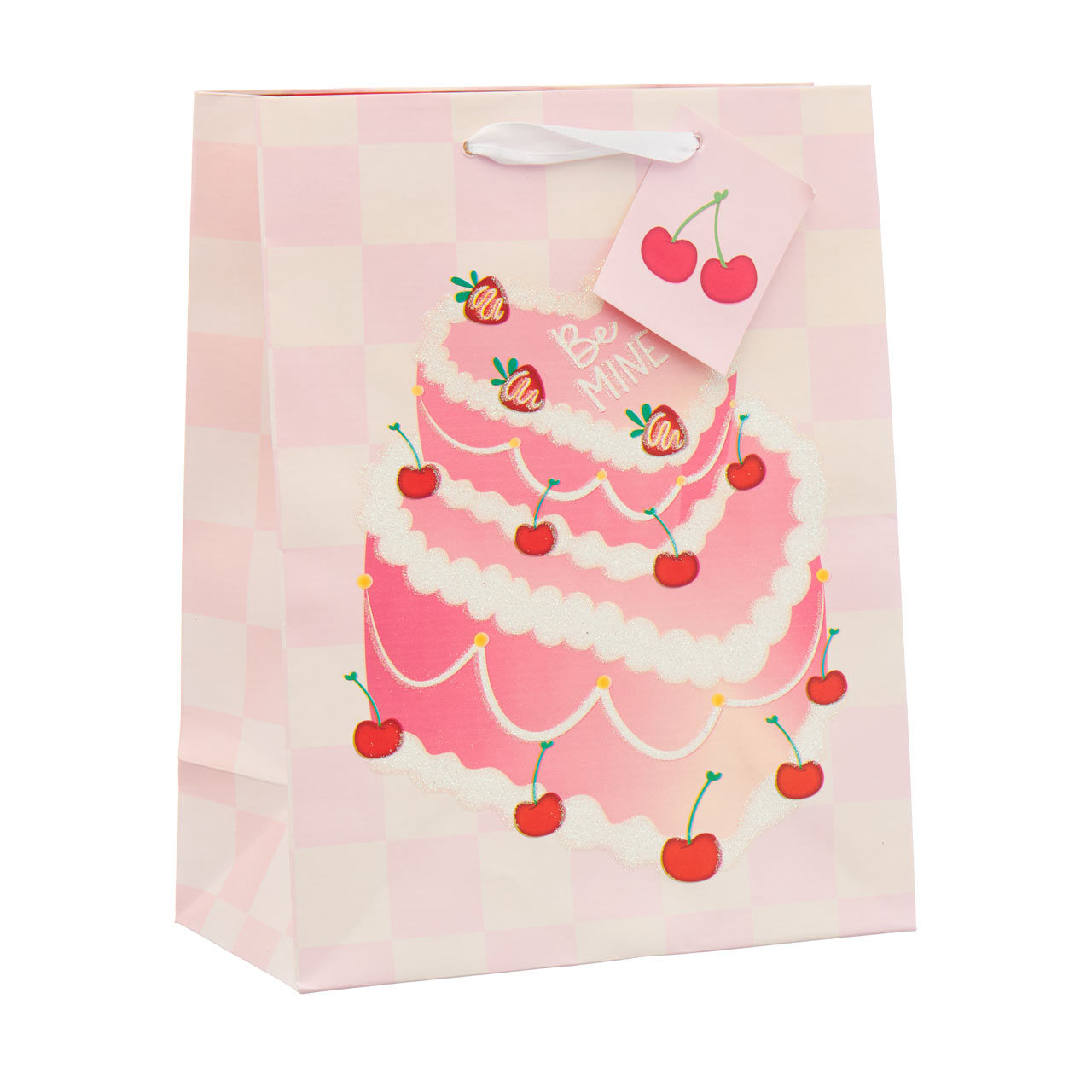 The gift bag showcases a delectable pink cake adorned with luscious cherries and intricate white frosting details, making it look almost good enough to eat. The cake is beautifully illustrated against a soft pink and cream checkered background, adding a touch of vintage charm to the overall aesthetic. The words "Be Mine" are elegantly inscribed on the cake, conveying a heartfelt message that’s perfect for the occasion.