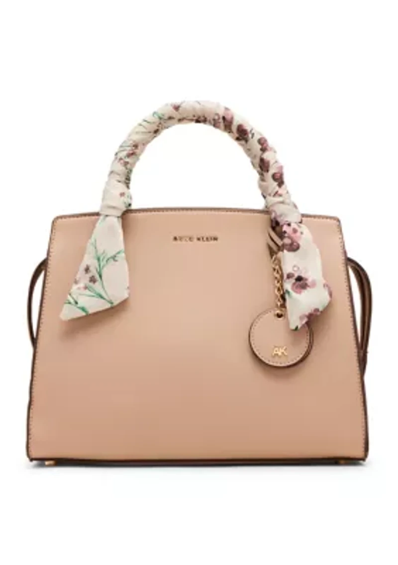 Elevate your style with this chic satchel from Anne Klein featuring an added scarf for a pop of color. Convertible strap with 3.5"-24" drop Exterior: features AK branded charms and a scarf wrapped handle Interior: one zip pocket and two slip pockets Imported Product Specifications 8.4” H x 11.8” L x 5.3” D Material & Care Self-color stitch trim PVC Clean with a damp cloth or soft brush