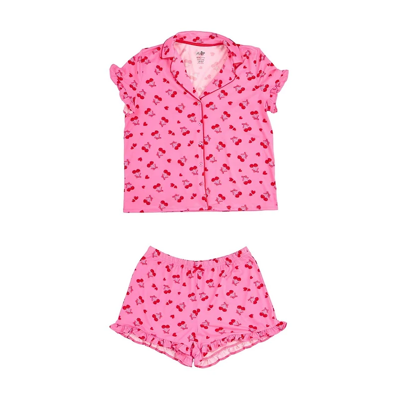 Crafted from soft, breathable fabric, this pajama set features a vibrant pink color adorned with an adorable cherry and heart pattern, adding a playful and romantic touch. The set includes a short-sleeve button-up top and matching shorts, both designed to offer a relaxed fit for a comfortable sleep.