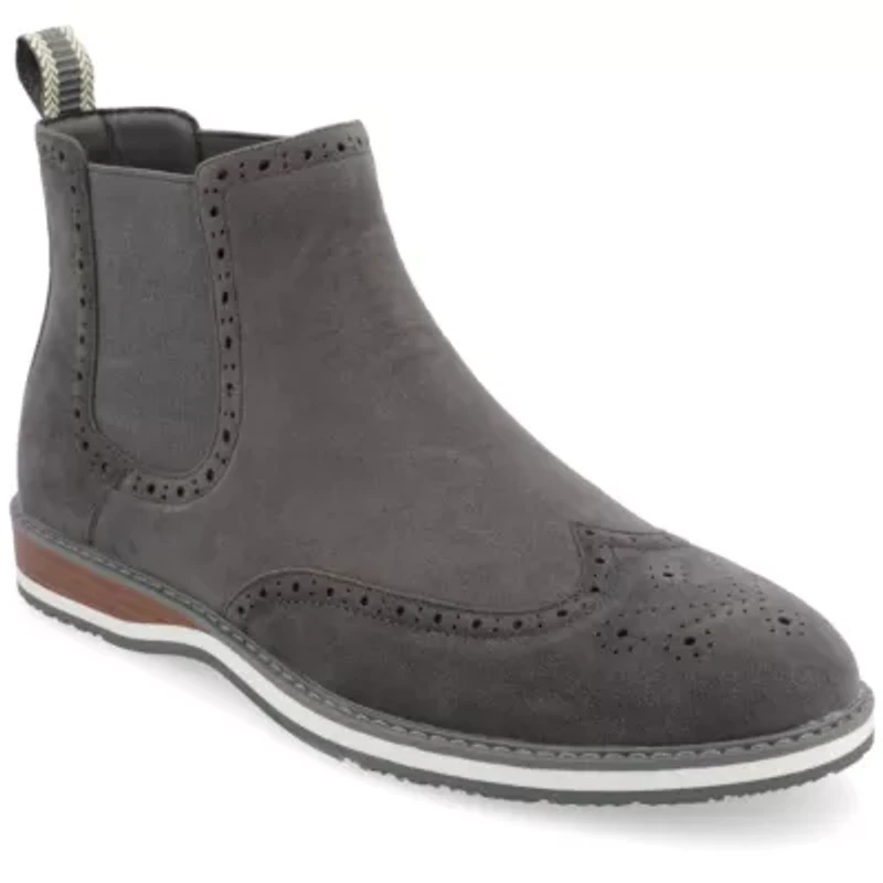 Introducing the Thorpe Chelsea boot by Vance Co. These suave boots are made with premium vegan leather for an upscale look. With a comfortable 12 mm tru comfort foam™ insole and a convenient pull-on silhouette with stretch gore accents, they offer both comfort and ease of wear. The 1-inch flat heel, closed-toe shape, and wingtip detailing give these classic Chelsea boots a touch of sophistication.