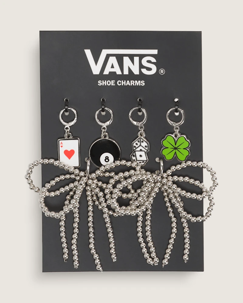 Express yourself with this set of Vans shoe charms. Featuring playful icons like an ace of hearts, 8-ball, dice, and four-leaf clover, these attachable accessories let you customize your kicks. The metal ball chain provides a sleek way to connect the charms, adding a touch of edgy style to your favorite Vans. Mix and match to create your own unique look that's authentically you.