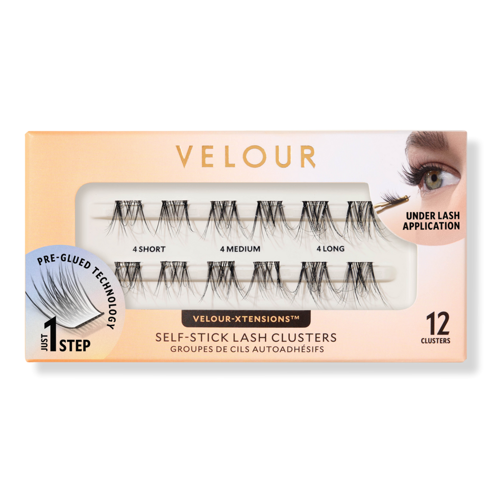 XTENSIONS SELF STICK HYBRID. Includes: 10mm Short Velour-Xtensions Self-Stick Lash Clusters (4 ct). 12mm Medium Velour-Xtensions Self-Stick Lash Clusters (4 ct). 14mm Long Velour-Xtensions Self-Stick Lash Clusters (4 ct). Features: 12 Soft & Wispy Velour-Xtensions Self-Stick Lash Clusters. Flirty lash style that lifts the eyes. Self-stick technology, perfect for beginners. Handmade with premium fibres. Recyclable packaging. Vegan & cruelty-free. Benefits: No glue needed. Beginner-friendly. Easy to apply. Comfortable. Customizable. Mess-free. Ready-to-wear. Lightweight & natural-looking.
