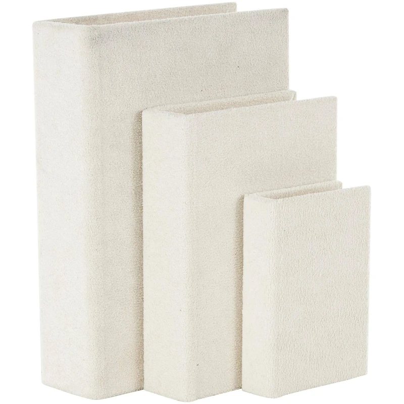 Inspired by sleek elegance and clean lines, a minimalistic design offers effortless luxury with monochromatic tones and bold, angular structures. Crafted from high-quality velvet fabric and MDF, the durability and longevity of this cream decorative box set is undeniable. Rectangle decorative storage box set boasts a sophisticated cream color with a textured finish, adding a modern touch to any space. This fabric set of three boxes features an innovative design that mimics the look of books, adding a unique touch to any décor. Ideal for storing keepsakes or small items, this cream set of three decorative keepsake boxes can be conveniently placed in your living room, bedroom or study for easy access.Details:Cream and gold coloredSet of 3 boxesDesigned with felt or rubber stoppers at the base that prevent scratching furniture and table tops, as well as sliding aroundVelvet fabric and MDFFor indoor use onlySize Information:Large box: 12.05" x 8.8" x 2.95"Medium box: 9.25" x 6.9" x 2.25"Small box: 6.45" x 4.5" x 1.65"