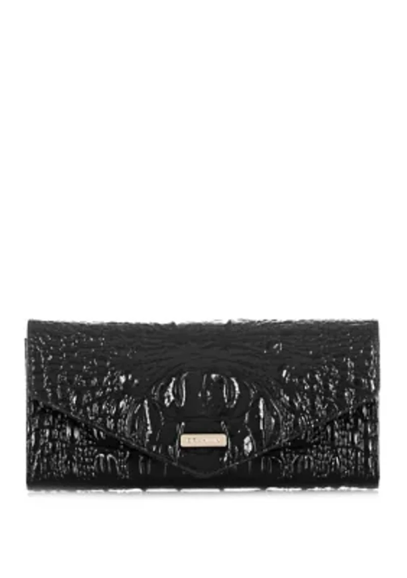 This chic envelope-style wallet from Brahmin is perfect for everyday use. Its snap closure securely stores your cards and cash, while an interior zipper pocket is perfect for receipts and change. With 9 credit card slots, a bill slot and an ID window, this wallet keeps you organized and stylish. The removable strap adds versatility, allowing you to carry it as a clutch or attach it to your wrist for hands-free convenience. Crafted from genuine leather, this wallet is durable and luxurious. Snap closure Removable strap Interior: 9 credit card slots Imported Product Specifications 7.5'' W x 4'' H x 0.75'' D Material & Care Leather Clean with a soft cloth