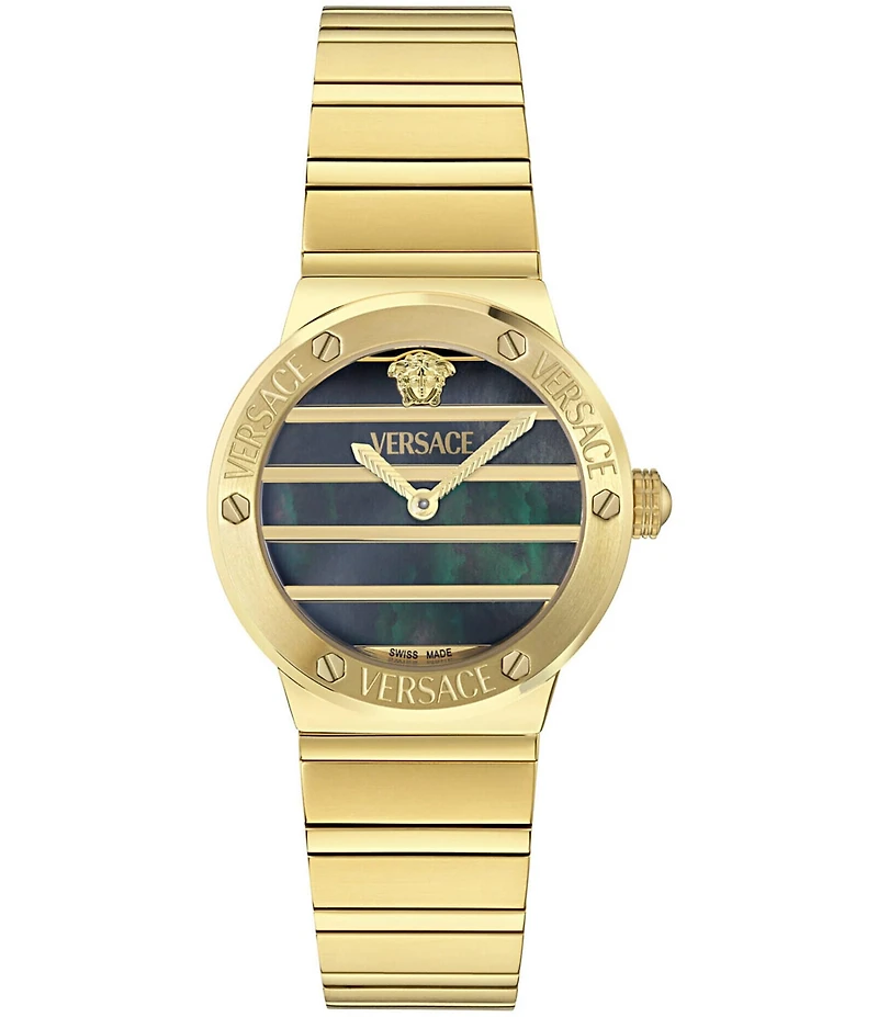 From Versace, this women's watch features: Gold tone stainless steel bracelet and case Mother of pearl dial Link/clasp closure Quartz analog movement Case size approx. 33mm Imported.