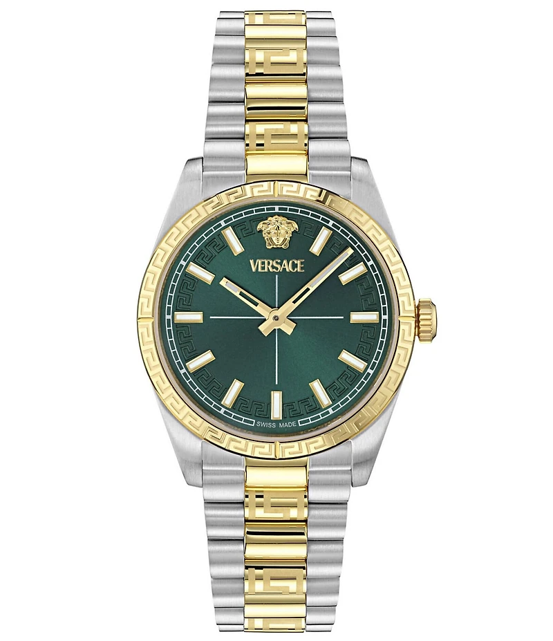 From Versace, the Women's Millennium Analog Two Tone Stainless Steel Bracelet Watch features: Two tone stainless steel bracelet and case Sunray dial Link/clasp closure Analog movement Case size approx. 32mm Imported.