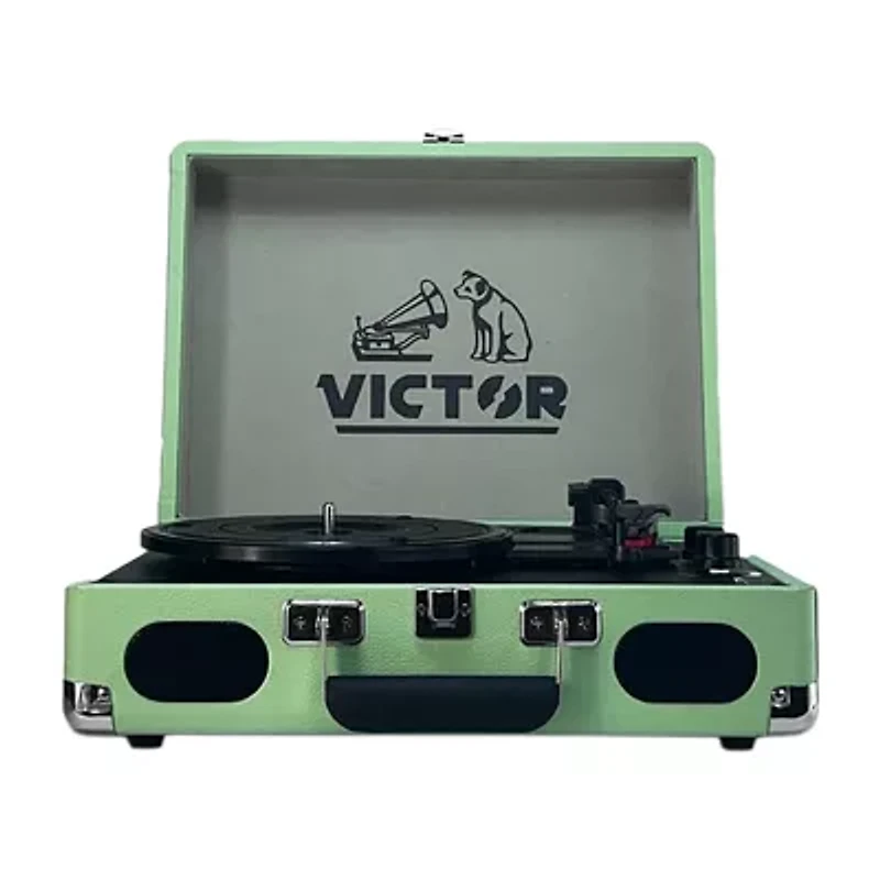 The Victor Metro Plus VSRP-850B is the perfect blend of vintage and modern with our 3-Speed Turntable. It plays 33 1/3, 45, and 78 RPM records, including a 45 RPM adaptor, and lets you stream music from your phone up to 33 feet away using Bluetooth IN. A built-in rechargeable battery powers built-in stereo speakers for seamless playback-perfect for impromptu listening anywhere. The retro suitcase design, complete with a secure latch, corner guards, auto-stop control, volume knob, headphone jack, and line-out, makes it as practical as it is eye-catching