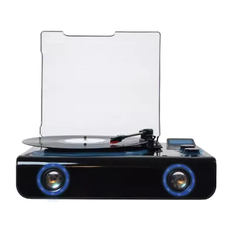 Victor beacon 5-in-1 turntable is ready to play your vinyl records & listen to your favorite radio stations with the built in 3-speed turntable & FM radio! The dual Bluetooth feature allows streaming of your vinyl records to an external Bluetooth speaker or plays music from your smart device through the beacon's built in speakers. The 3.5mm aux input & RCA audio output allow for even more additional playback options. Blue accent lighting gives the beacon a great 90's feel.