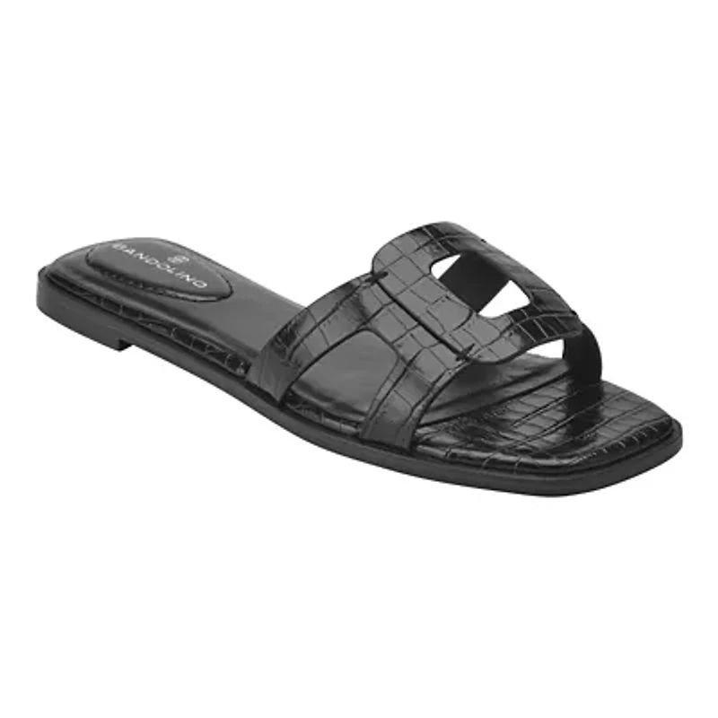 The Bandolino Vienma flat sandals will add instant style to any outfit. Featuring a square toe, slip-on silhouette and sleek design. The sandal is the perfect wardrobe staple! Established in 1960, Bandolino is a mix of timeless design and uncompromising quality. -Material: Faux Leather Slip-on Imported Product Specifications 0.39 in. M Material Faux Leather