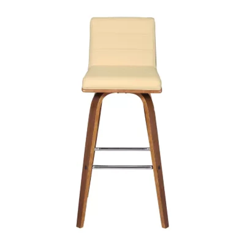 Elevate your space with the classic and sophisticated Vienna swivel faux leather and wood counter or bar stool by Armen living. This sleek and versatile barstool seamlessly combines style and comfort with its mid-century modern design, effortlessly integrating into your home's existing decor. With the 360-degree swivel function, you and your guests have optimal mobility for staying engaged, regardless of your place in the room at any party and gathering. The sturdy frame is constructed with four robust wooden legs, elegantly accentuated by a plush, high-density foam cushion enveloped in high-grade faux leather upholstery. A square, steel footrest adds a touch of chic style without compromising practicality. The soft faux leather upholstery makes the Vienna and ideal choice for any entertaining home! With its two seat height options and armless design, you can the Vienna easily complements your kitchen island, peninsula counter, or home bar. The padded backrest, designed with ergonomic properties, ensures both comfort and proper alignment during use. Ideal for any home or apartment, the Vienna promises enduring comfort with its quality materials, guaranteeing a stylish and comfortable seat for years to come. Choose from the Vienna counter or bar stool in 26" or 30" seat height, available in either a black wood finish with gray faux leather or a walnut wood finish with cream, gray, or brown faux leather to suit your individual taste and enhance your space.