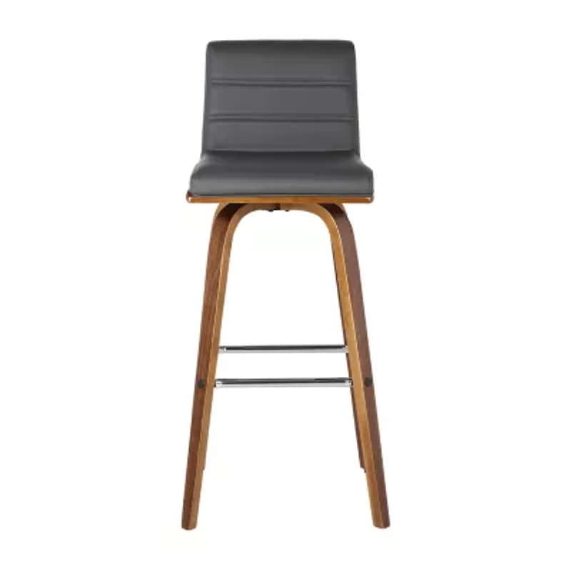 Elevate your space with the classic and sophisticated Vienna swivel faux leather and wood counter or bar stool by Armen living. This sleek and versatile barstool seamlessly combines style and comfort with its mid-century modern design, effortlessly integrating into your home's existing decor. With the 360-degree swivel function, you and your guests have optimal mobility for staying engaged, regardless of your place in the room at any party and gathering. The sturdy frame is constructed with four robust wooden legs, elegantly accentuated by a plush, high-density foam cushion enveloped in high-grade faux leather upholstery. A square, steel footrest adds a touch of chic style without compromising practicality. The soft faux leather upholstery makes the Vienna and ideal choice for any entertaining home! With its two seat height options and armless design, you can the Vienna easily complements your kitchen island, peninsula counter, or home bar. The padded backrest, designed with ergonomic properties, ensures both comfort and proper alignment during use. Ideal for any home or apartment, the Vienna promises enduring comfort with its quality materials, guaranteeing a stylish and comfortable seat for years to come. Choose from the Vienna counter or bar stool in 26" or 30" seat height, available in either a black wood finish with gray faux leather or a walnut wood finish with cream, gray, or brown faux leather to suit your individual taste and enhance your space.