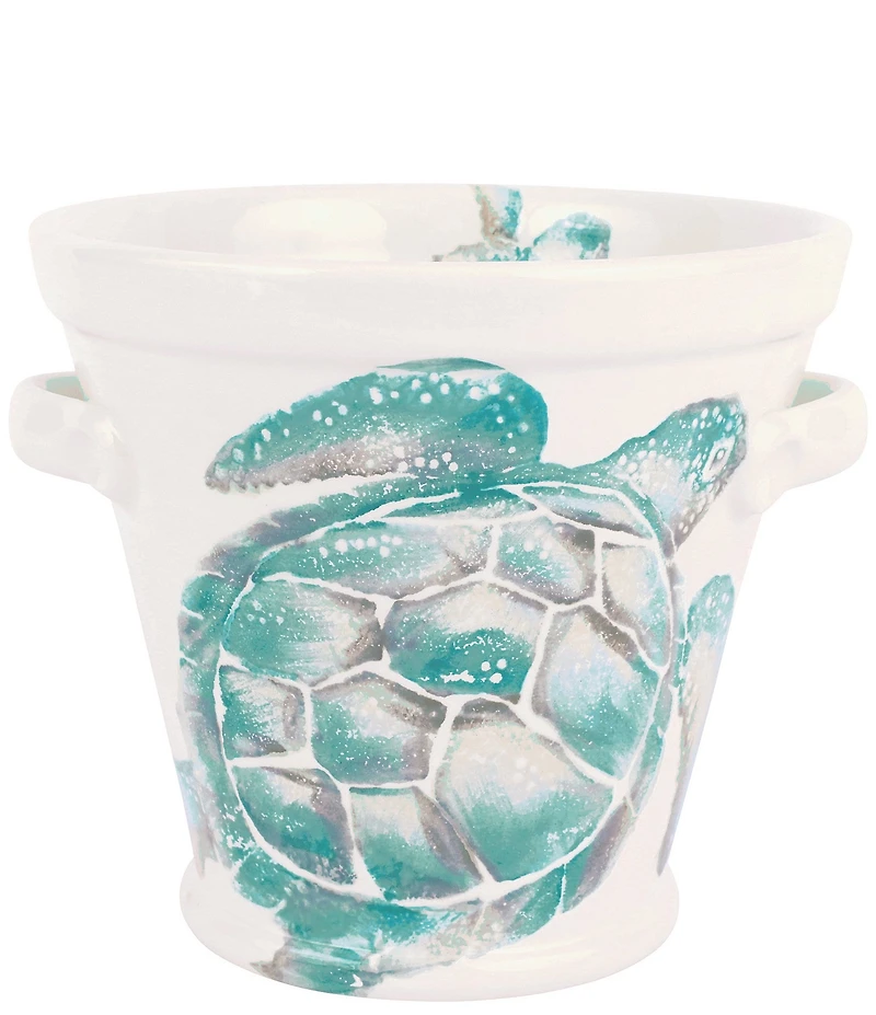 From the Tartaruga Collection by VIETRI, this ice bucket features: Handpainted sea turtles in hues of aqua and taupe glide across a clean, white canvas on the Tartaruga Ice Bucket. Maestro artisan, Gianluca Fabbro, utilizes a unique sponging technique to carefully add detail to each piece. Earthenware Tartaruga Collection Hand-painted detail Sea turtles in hues of aqua and taupe Designed by Gianluca Fabbro Dishwasher and microwave-safe Measures approx. 11.5" L x 10" W x 8.5" H Imported.