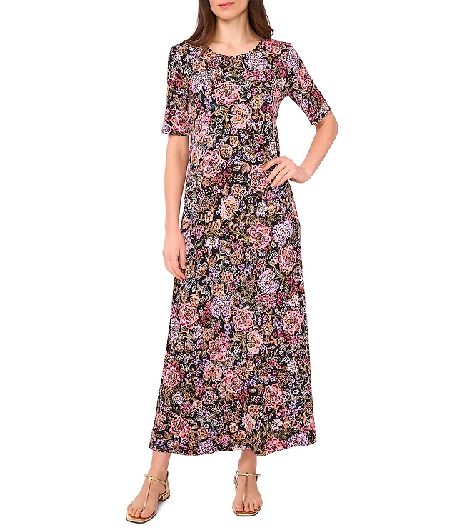 Vince Camuto Knit Floral Print Round Neck 3/4 Sleeve A-Line Maxi Dress