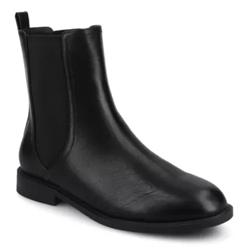 The Violet Chelsea boot by Journee is a timeless staple, featuring a sleek faux leather upper and a sophisticated almond-toe design. With stretch gore panels, it offers a snug yet flexible fit, making it easy to slip on and off. The 1-inch block heel provides subtle elevation while ensuring all-day comfort and effortless style. Slip-on Padded insole China Imported Product Specifications 1 in Flat 6 IN M Material Man-made polyurethane