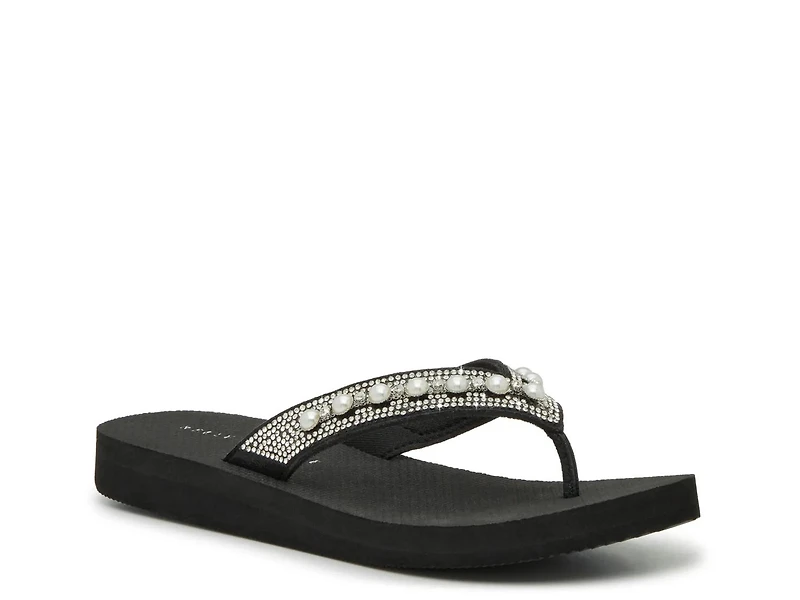 Add a touch of elegance to a simple silhouette with the Visciola sandals from Kelly & Katie. This casual flip flop-inspired style is crafted with rhinestone accents and pearl encrusted embellishments along the strap.