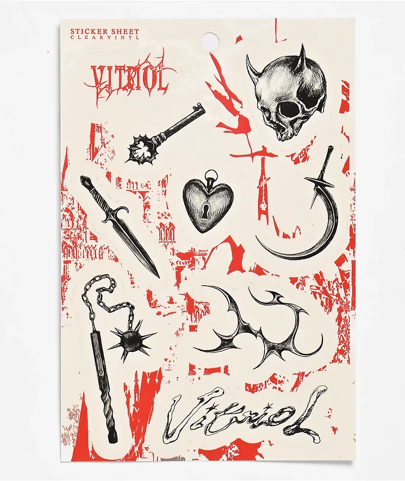 Vitriol introduces the Flash of Darkness sticker sheet with nine stickers inspired by gothic tattoo designs. Each sticker is printed on clear vinyl, and adds an alternative touch to any smooth surface.