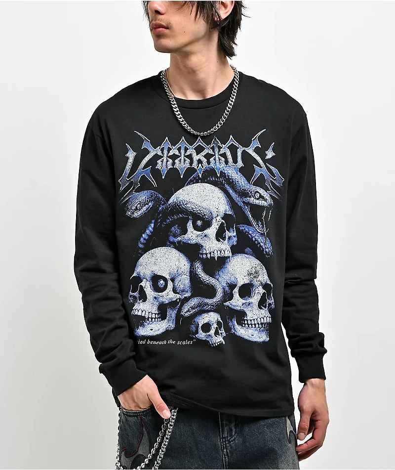 Add a dark, gothic vibe to any outfit with the Serpent's Reign long sleeve t-shirt from Vitriol. The black tee has artwork on the front of snakes curled around a pile of skulls, while the back showcases an impaled serpent for an alternative look.