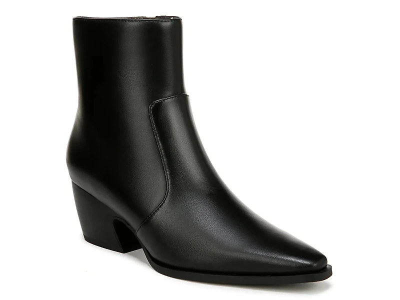 Become inspired by the fabulous Western-inspired Franco Sarto Vittorio bootie. The leather bootie, designed with an elegant pointed toe, has an inside zipper for easy on/off. A flared block heel brings a fashionable lift.