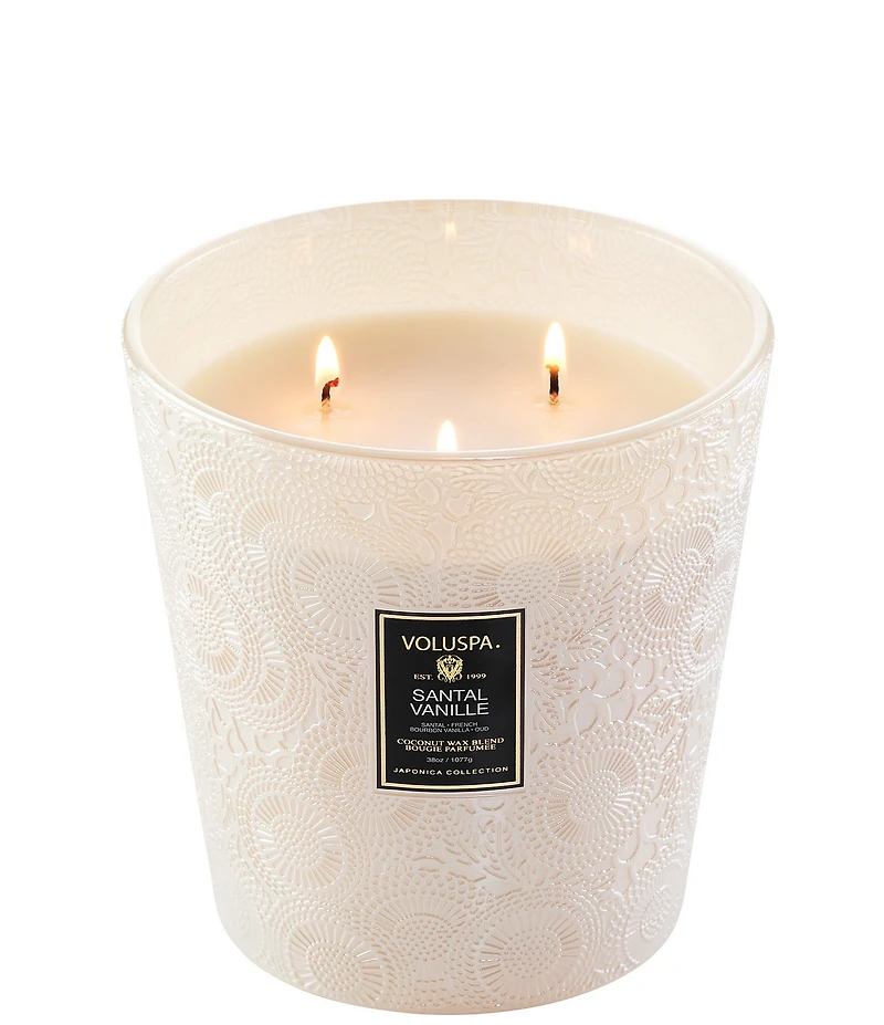 From Voluspa, the Santal Vanille 3 Wick Hearth Candle features: A veil of intoxicating vanilla, exotic oud and warmest sandalwood mingle in a sensually smooth, creamy brulée, casting a quiet glow from lust-worthy, pearlescent glass as captivating as the fragrance. Vanilla lovers, you're welcome. Japonica Collection 100% natural 3 wicks Proprietary clean-burning coconut wax blend Housed in 38-oz. embossed glass jar Comes in decorative gift box Free of sulfates, phlalates, and parabens Never tested on animals Up to 80 hrs. of burn time Approx. 8-oz; 6.25" diameter Handcrafted in California Care and use instructions: Trim wicks to 1/4" with each burn. Place candle on a heat resistant surface or candle tray. Allow wax to melt to the candle's edge every burn to prevent tunneling. Keep candles away from drafts to ensure a smokeless, clean burn. Use a wick snuffer to extinguish a candle without soot or smoke. Discontinue burning a candle when less than 1/4" of wax remains. Fragrance Family: Gourmand Fragrance Notes: Santal, French Bourbon Vanilla & Oud Made in the USA.