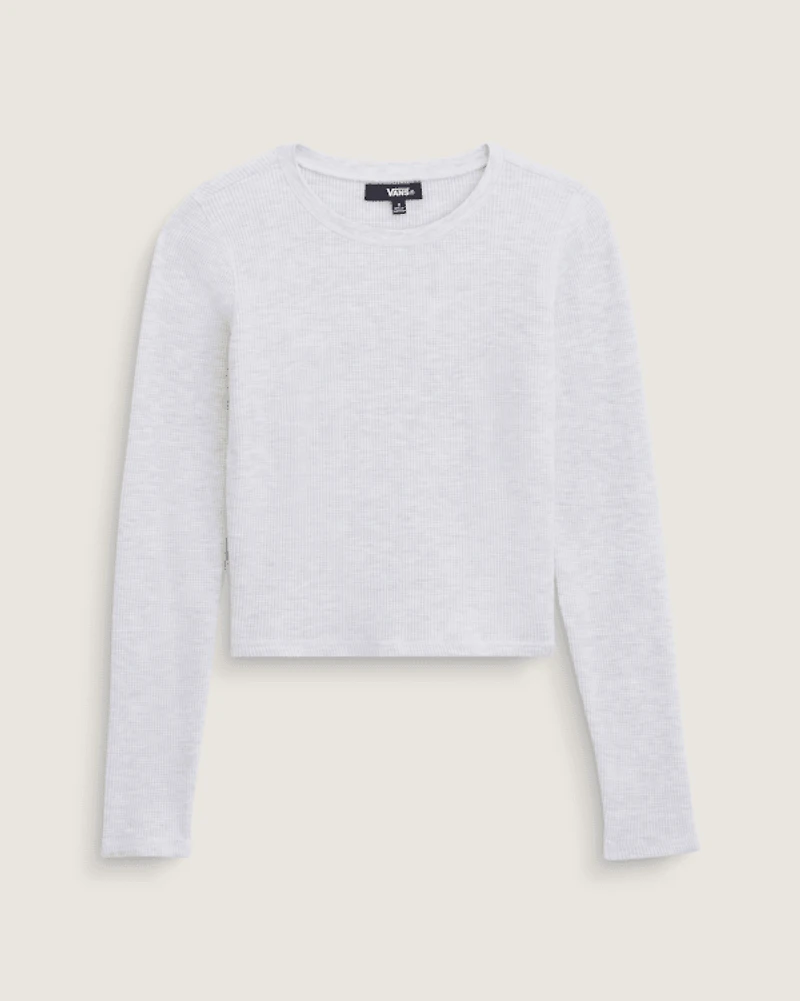 This cropped long sleeve top brings laid-back Vans style to your everyday wardrobe. The soft, ribbed texture and fitted cut create a flattering silhouette that pairs easily with high-waisted bottoms. With a classic crew neckline and subtle branding, it's a versatile piece you'll reach for again and again.