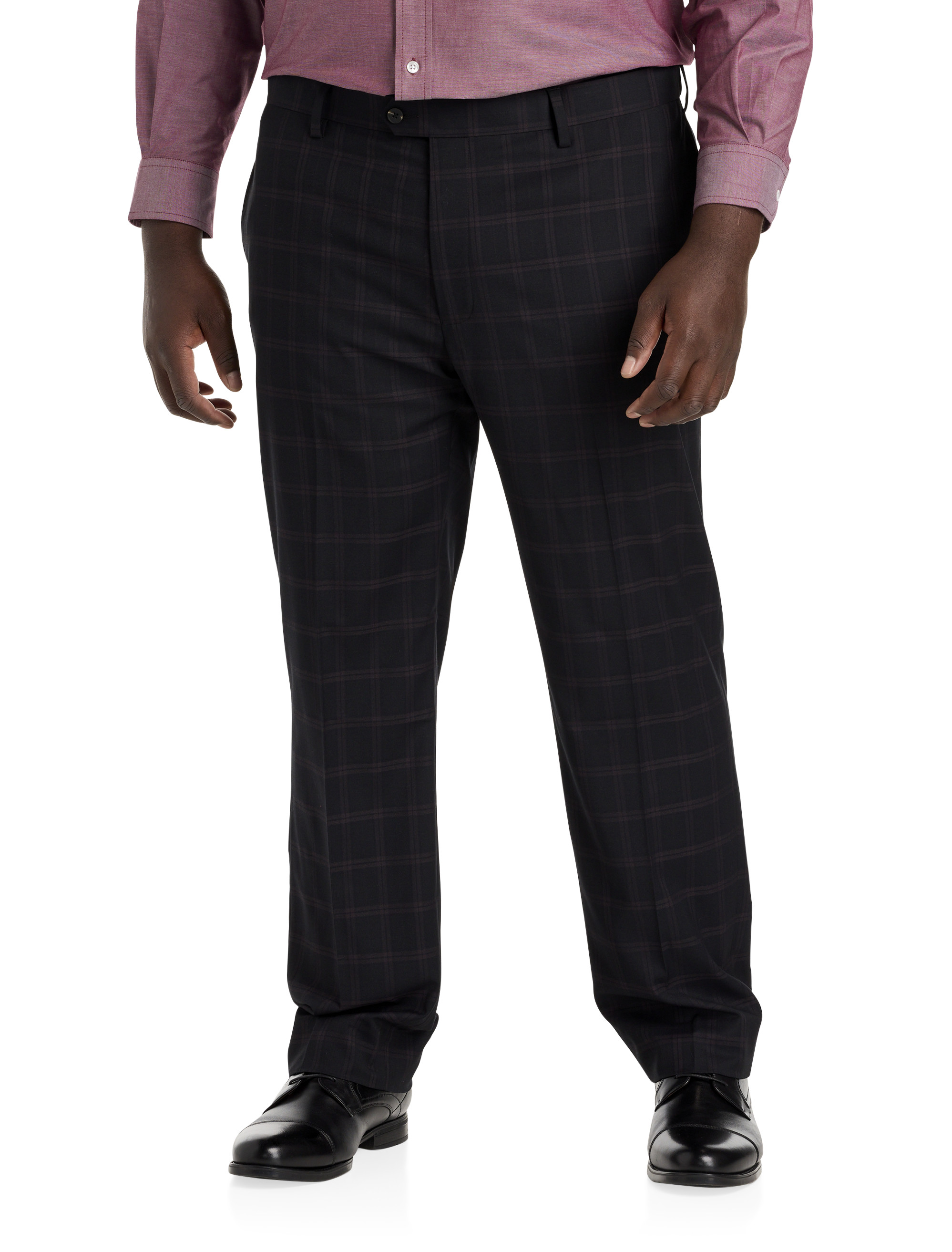 Crafted with a bit of stretch for comfort, these polyester blend dress pants were designed in a contemporary, flat-front style that's perfect for work or special occasions. The signature, hidden waist-relaxer waistband expands up to an extra four inches for total comfort throughout your day. Designed at DXL with precise proportions and an ideal fit for Big and Tall sizes, the stretch fabric has shape retention which enhances the garment's wearability. An allover plaid pattern adds eye-catching appeal and the 32" inseam can be easily altered to 34" to better fit our taller guests.