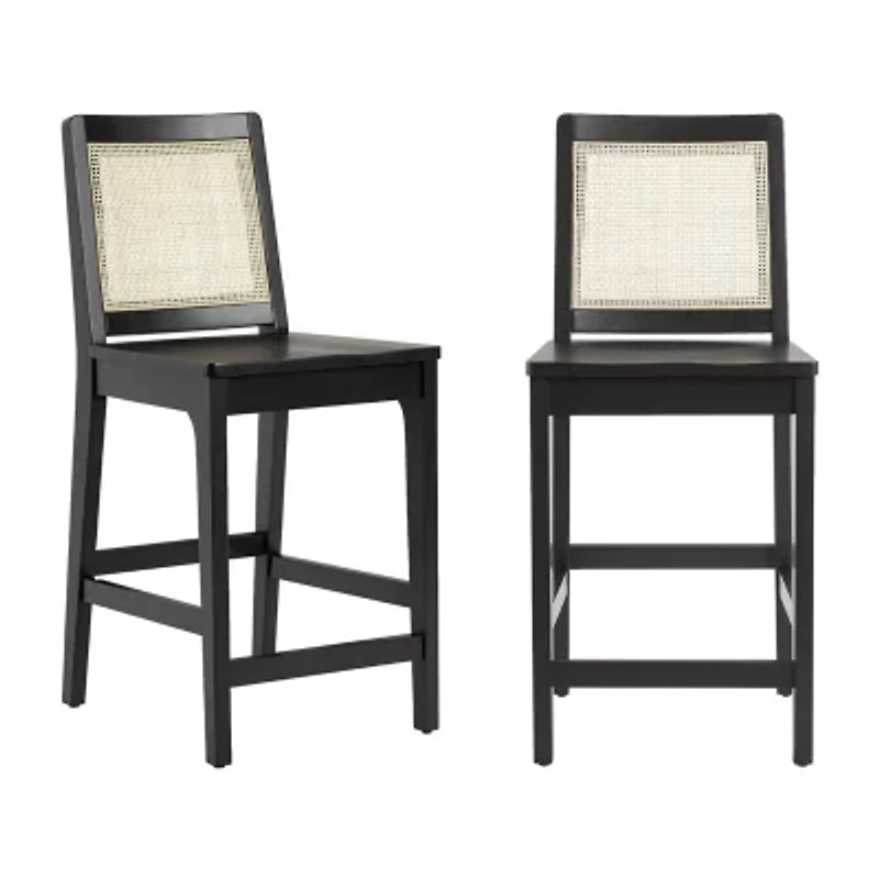 If you're a fan of transitional or boho design, this set of two solid wood counter stools is a match made in heaven. The natural rattan back panel and black painted wood add a dark but unique textural touch to any room. The solid rubberwood base is durable enough to stand up to everyday use and provides a welcome contrast to the rattan detail. Quick, easy assembly means you can start enjoying your stools right away, and the nylon sliders protect your flooring so you can spend less time worrying and more time making memories at home.