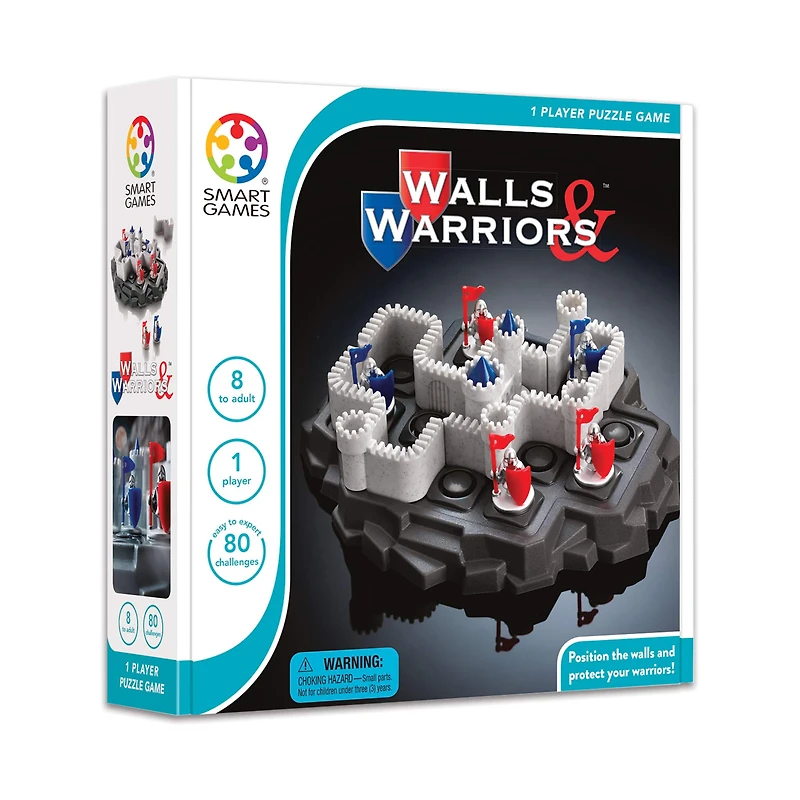 Brain power is needed to protect your castle in this exciting game! Featuring a beautiful 3D game board and intricately detailed knights, Walls & Warriors includes 80 increasingly difficult challenges where players must protect the blue warriors within the castle by arranging the walls to keep the red invaders out.