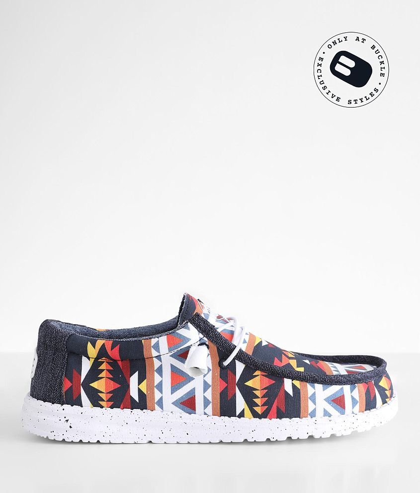 Lightweight southwestern print shoe Stretch drawcord laces Cushioned leather footbed Flex & fold technology