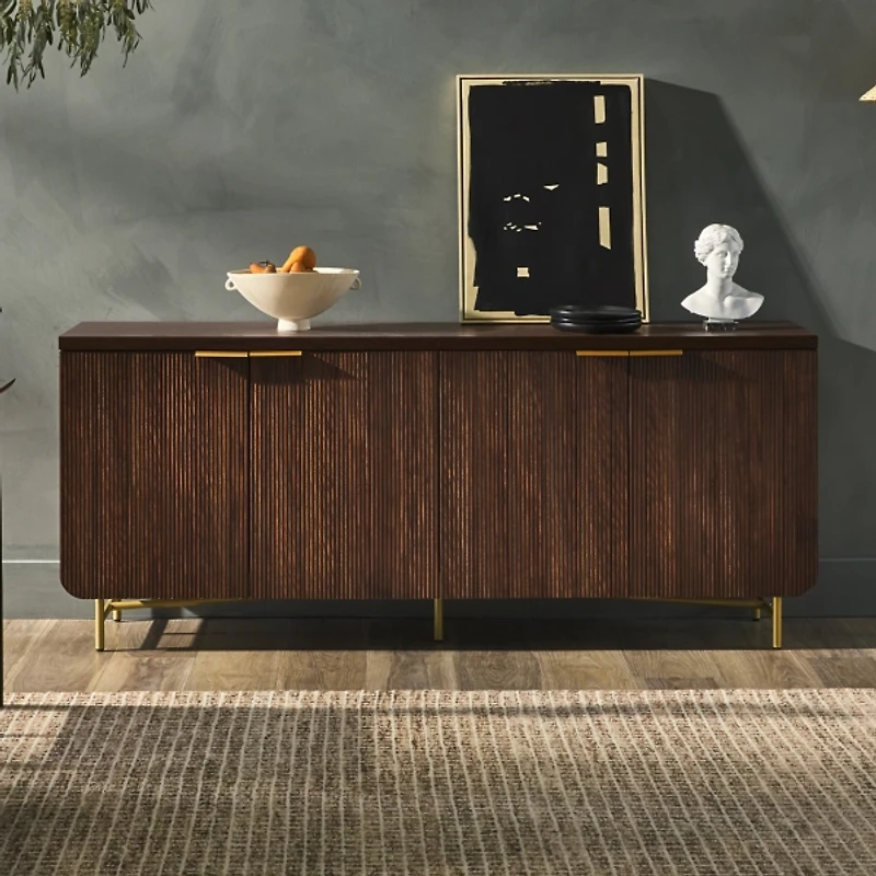 Sleek yet timelessly stylish, this Walnut Wood Scandinavian 4-Door Cabinet is the statement piece you’ve been looking for! You’ll love the ample interior space behind the unique reeded doors! Cabinet measures 69W x 17.75D x 28.75H in. Crafted of warp-resistant MDF and durable laminate Walnut finish Features four (4) fluted doors Accented with gold legs and hardware Shelves measure 33.25W x 14.13D x 11H in. Equipped with cord management ports Weight: 127 lbs. Weight capacity: 150 lbs. Assembly required Not intended for commercial use Care: Wipe with a soft, dry cloth. This item is available at Kirklands.com only, not available in stores. Please note: this item cannot be shipped to APO/FPO addresses.