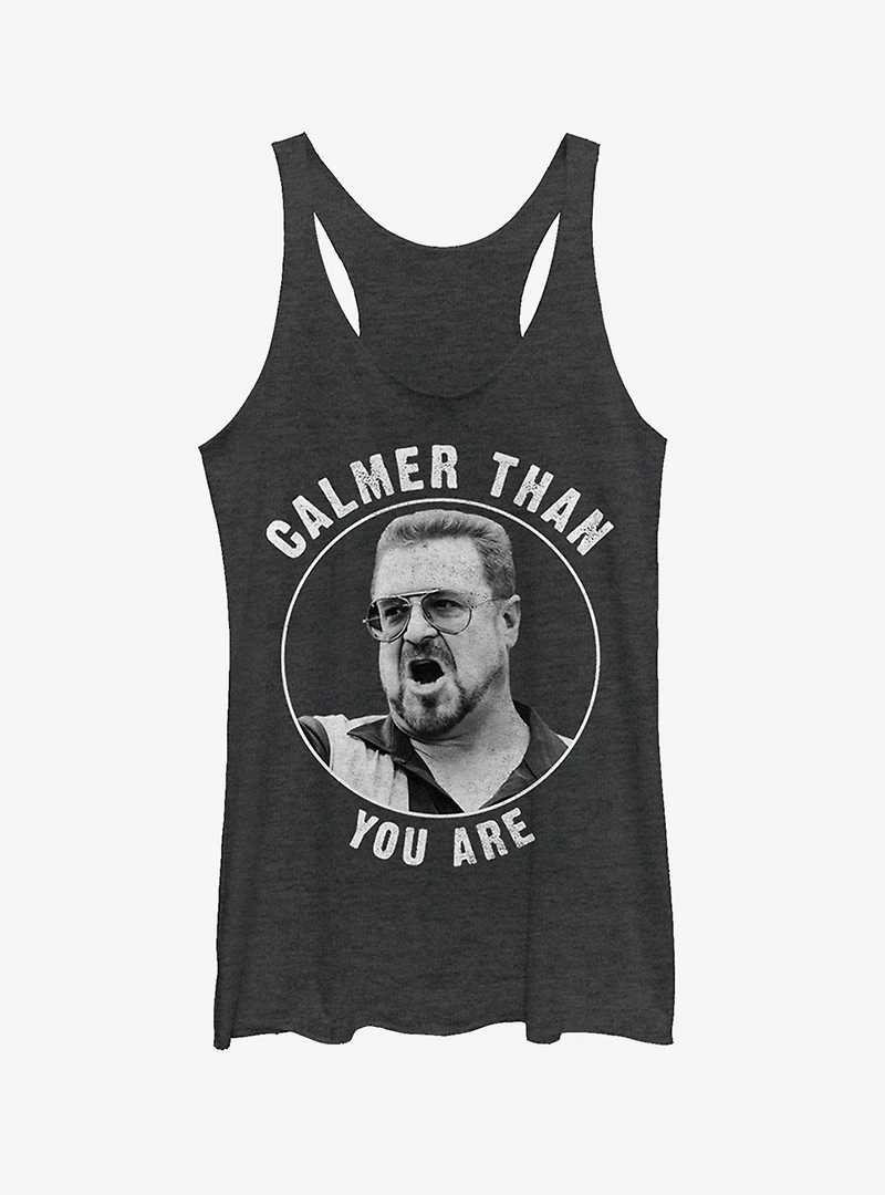 Walter might have an anger problem but he's always got The Dude's back so celebrate him with The Big Lebowski Walter Calmer Than You T-Shirt. The Dude's bowling buddy, Walter, is encircled by "Calmer Than You" on this funny Big Lebowski tee. Designed with raw-edge hems.