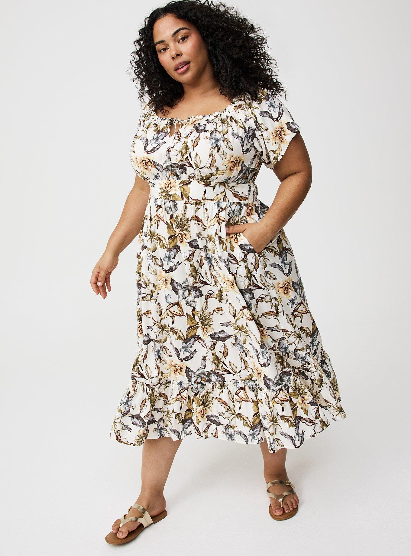 FIT Tea length. Measures 52'' from shoulder (size 2). MATERIALS + CARE Washable Challis woven fabric: New, improved, and loved by all—and still lightweight, drapey, and (really!) machine-washable. Stretch level: None. 82% Viscose, 18% Lyocell. Machine wash cold. Tumble dry low. Imported. DETAILS Off-shoulder neckline. Short peasant sleeves. Notch and tie details. Functional pockets.