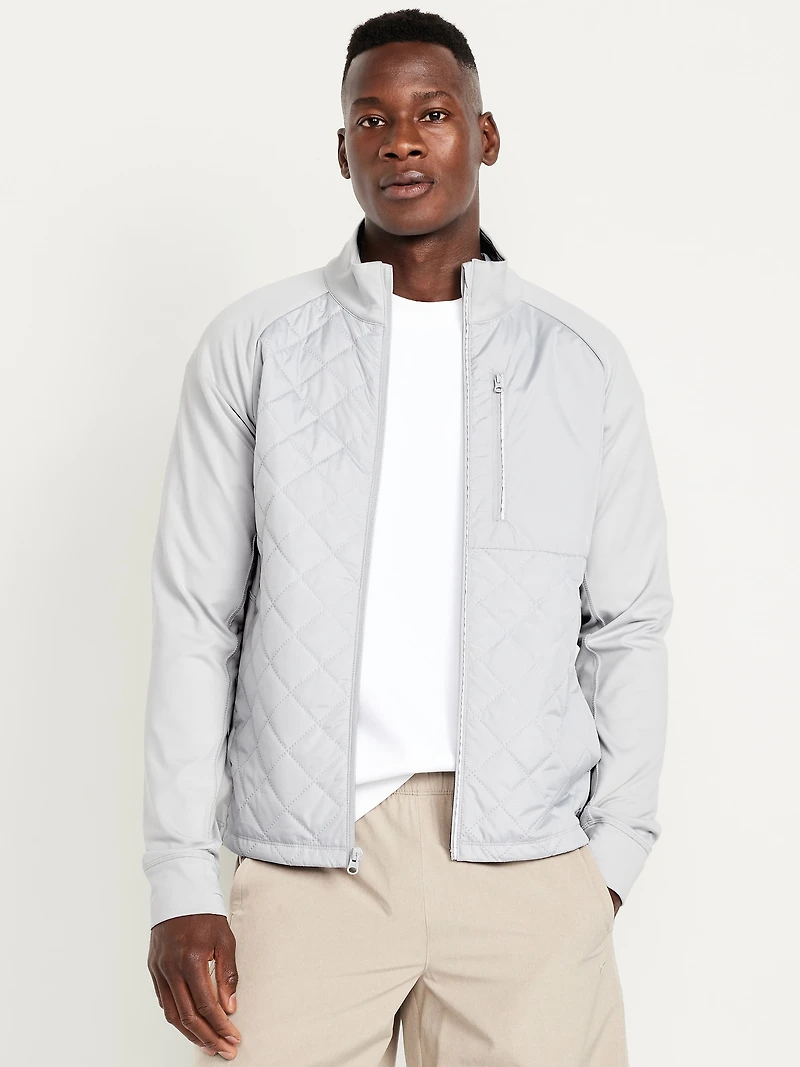 quilted body with fleece sleeves mock neck raglan sleeves with thumbhole cuffs full-zip front zippered chest pocket relaxed fit cropped length hits just below waist model is approx. 6'1" and wears size mmachine wash according to the care instruction label .