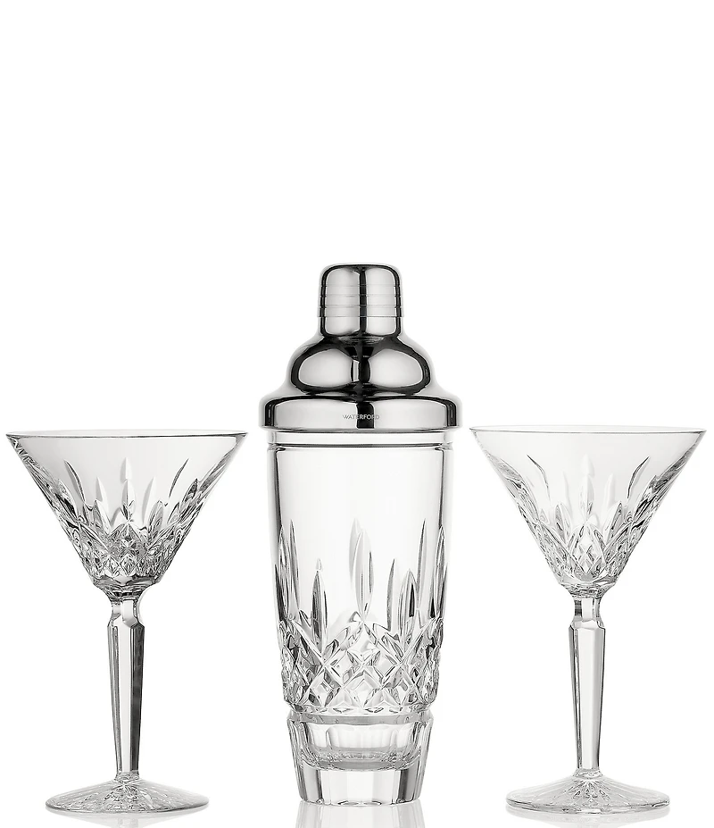 From the Lismore Collection by Waterford, this 3-piece shaker set features: The legend of Lismore began in 1952, when it was first created by our visionary Chief Designer Miroslav Havel. This exquisite pattern pays homage to the Gothic splendor of the 800-year-old Lismore Castle, drawing inspiration from the harmonious symmetry of its towers, the graceful pointed arches, and the fine curves of its windows. Enhance your cocktail experience with this refined set, featuring the iconic Lismore shaker and a pair of sleek martini glasses. A stylish tribute to fine design and expert craftsmanship—ideal for the sophisticated host. Lismore – Waterford’s most iconic pattern, inspired by the dramatic beauty of Lismore Castle’s Gothic architecture Distinguished by its signature diamond and wedge cuts, designed to capture and reflect light with dazzling brilliance Meticulously crafted from premium lead-free crystal, offering exceptional clarity and lasting durability Perfect for mixing cocktails or raising a toast in sophisticated style An exquisite choice for weddings, bridal registries, and elevated gifting occasions Elegantly presented in Waterford’s signature packaging Wash separately in warm soapy water, rinse thoroughly & dry with a lint free cloth Each Measures Approx. Shaker - 3.62" W x 7.64" H, capacity 24-oz. Approx. 2 Martini - 4.57" W x 7.09" H, capacity 6.425-oz. Imported.