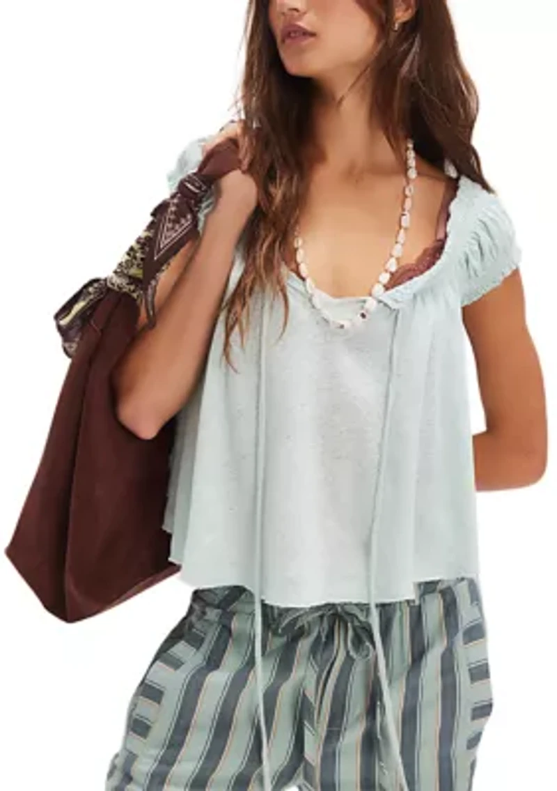 Forever-timeless from our We The Free collection, this billowy top is featured in a soft cotton-linen blend and short-sleeve style with a low scoop-neckline and functional tie detail. Fit: Shapeless silhouette, hip-length style Features: Soft cotton-linen blend, scoop-neckline with smocked trim, functional tie at center front, cap-inspired sleeves, gathered detail for added dimension Imported Product Specifications 20.5" L Material & Care Linen, cotton Machine washable