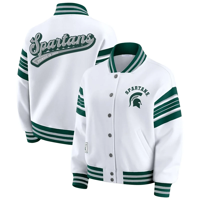 Show your Michigan State Spartans team spirit with a dash of retro style in this Satin Stitch Full-Snap Fleece Sweatshirt Jacket from WEAR by Erin Andrews The satin stitch detailing and bold team graphics add a touch of elegance making it a standout piece in your game day wardrobe The midweight design is perfect for moderate temperatures keeping you cozy and stylish while you cheer on the Michigan State Spartans