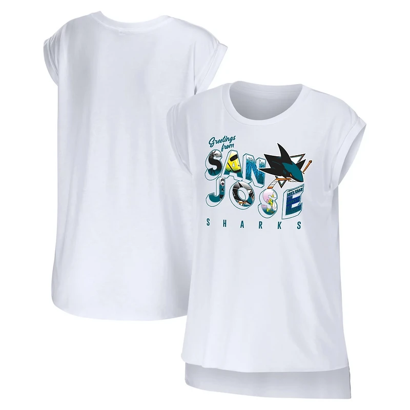 Celebrate your unwavering San Jose Sharks fandom with the Women's WEAR by Erin Andrews White San Jose Sharks Greetings From Muscle T-Shirt This stylish tee features a raw-edged droptail hem and screen-print graphics that proudly display your allegiance to the San Jose Sharks Made from a comfortable polyester and viscose blend this t-shirt is perfect for game days or any day you want to show your support for the San Jose Sharks