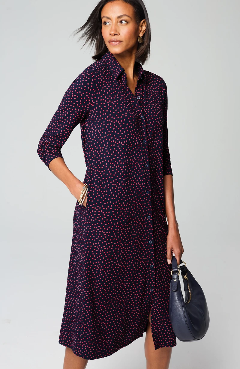 It's the best of both worlds: the polish of a shirtdress plus the relaxed feeling of your favorite knits. This winning piece has all the classic details you look for––like a shirt collar and functional button front––plus a flattering waist seam, discreet side-entry pockets and an allover print. Unlined. You can feel good about wearing this style because it contains LENZING™ ECOVERO™ fibers. The manufacturing of LENZING™ ECOVERO™ Viscose fibers generates up to 50% lower emissions and water impact compared to generic viscose.