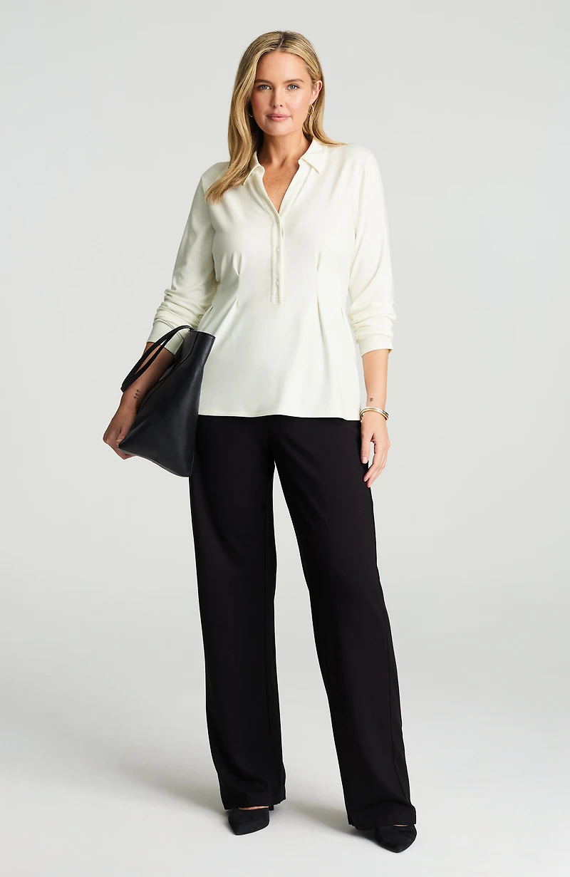 One of our new favorite staples, our soft knit shirt features placed waist pleats that create a flattering peplum effect. The half placket is finished with a shirt collar and a trio of buttons. You can feel good about wearing this style because it contains LENZING™ ECOVERO™ fibers. The manufacturing of LENZING™ ECOVERO™ Viscose fibers generates up to 50% lower emissions and water impact compared to generic viscose.