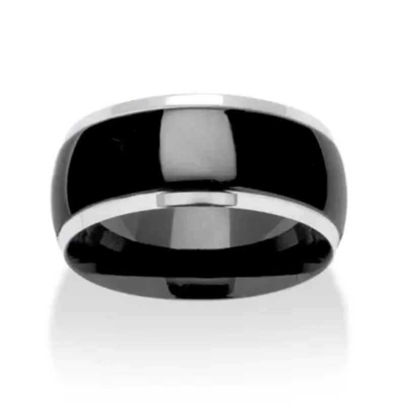 This sleek wedding band showcases a raised black stripe around the center. For optimal appeal, this comfort-fit band features a smooth interior to lend a silky feeling around your finger. 10 mm width. Black ion-plated stainless steel. Tarnish free and waterproof! Silvertone metal accents. Available in sizes 7-13.Black Ion-Plated Stainless SteelMeasures: 10 mm wide x 10 mm long x 2 mm high; Shank Width: 10.0 mm wideIncludes gift box and drawstring pouchBlack Ion-Plated Stainless SteelShank Width: 10.0 mm wideDimensions: 10 mm wide x 10 mm long x 2 mm highIncludes gift box and drawstring pouch Polished finish Warranty available China Imported Product Specifications 0.47 in x 0.39 in x 0.39 in Material & Care Metal, Stainless steel Clean with a soft cloth.