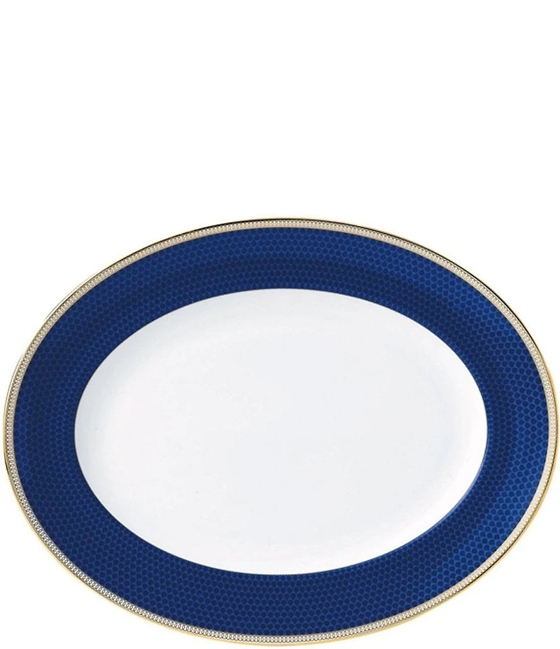 From the Hibiscus Collection by Wedgwood, this platter features: Fine bone china Hibiscus Collection Gold banded Oriental blue hues and lavish botanical pattern Dishwasher safe Approx. 8" W x 6" dia. x 3" H Imported.